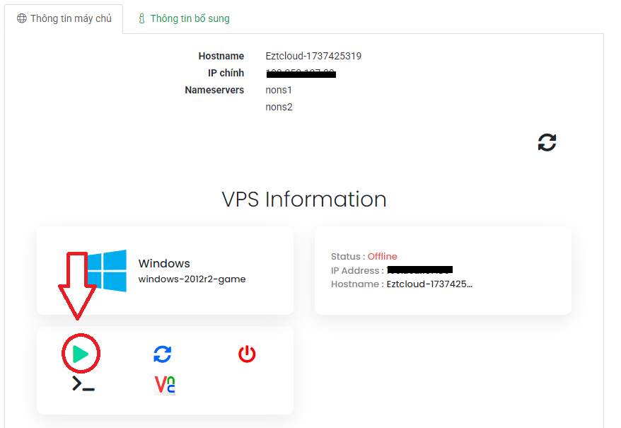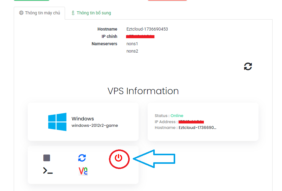 Bước 4: Sau đó quý khách nhấn nút Start/Stop the VPS như hình